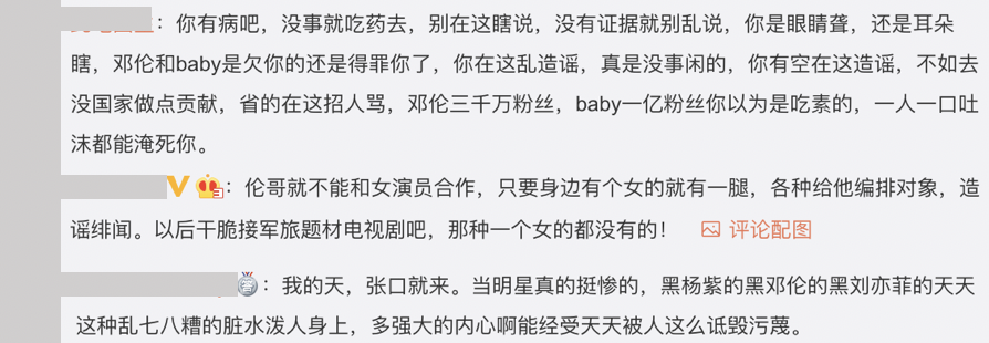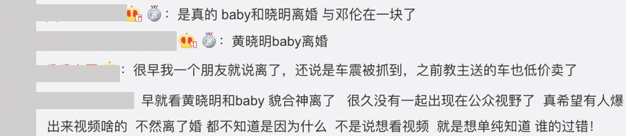 然而這則消息也引起許多人討論,有一派的網友認為這根本是無稽之談,紛紛留言:「你有病吧,沒事就吃藥去,別在這瞎說,沒有證據就別亂說」、「倫哥就不能和女演員合作,只要身邊有個女的就有一腿,各種給他編排對象,造謠緋聞」、「我的天,張口就來。當明星真的挺慘的」,但也有網友認為真有此事,留言寫下:「很早我一個朋友就說離了,還說是車震被抓到,之前教主送的車也低價賣了」、「早就看黃曉明和baby 貌合神離了」、「是真的 baby和曉明離婚 與鄧倫在一塊了」