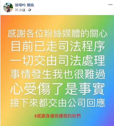 鮪魚也在辜莞允發文後的2個小時,在臉書首次發出聲明,提到此案目前已走「司法程序」,一切交由司法處理,也無奈透露:「事情發生我也很難過,心受傷了是事實,接下來都交由公司回應,感謝身邊保護我的你們。」打臉了辜莞允說法,兩人友情宣告決裂。