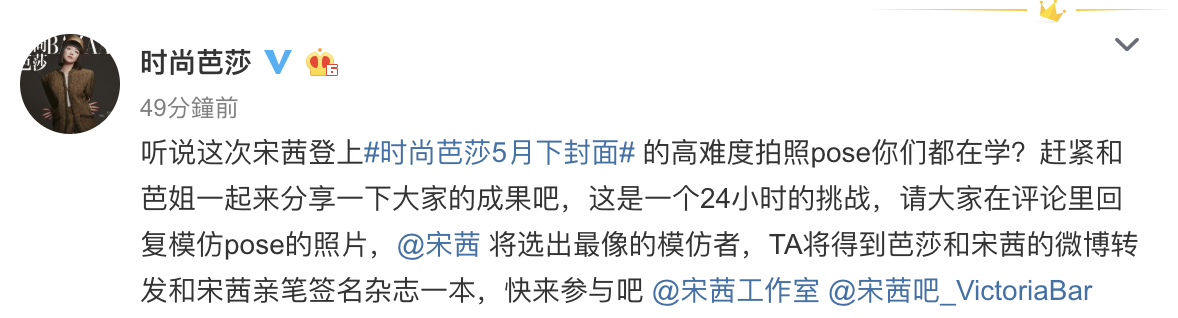 時尚雜誌《BAZAAR》今年二度邀請宋茜擔任封面人物,這次宋茜的髮型變化成為平瀏海的造型,相較過去的空氣瀏海,這次是走一個厚重的瀏海造型,而她在封面上的姿勢也相當特別,她將雙手反折放置背後,高難度的姿勢讓雜誌官方微博都發文邀請粉絲們來挑戰這個高難度的pose,而在雜誌內頁中,宋茜也換上多套不同風格的服裝,眼神與pose都展現出高強度的時尚。
