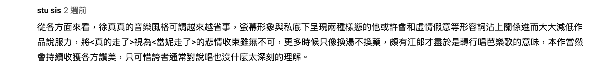 知名神秘樂評人「stu sis」也出現在下方留言處,並點評這首歌:「從各方面來看,徐真真的音樂風格可謂越來越省事,螢幕形象與私底下呈現兩種樣態的他或許會和虛情假意等形容詞沾上關係進而大大減低作品說服力,將<真的走了>視為<當妮走了>的悲情收束雖無不可,更多時候只像換湯不換藥,頗有江郎才盡於是轉行唱芭樂歌的意味,本作當然會持續收獲各方讚美,只可惜誇者通常對說唱也沒什麼太深刻的理解。」,許多網友也認為他根本是在炒冷飯,新歌了無新意。
