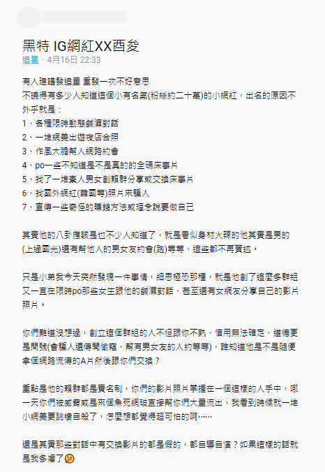 昨(16)日有網友在Dcard發文《黑特 IG網紅XX酉夋》,其中所指的對象就是「童酸酸」,只見該網友質疑童酸酸發的床事片根本不知道是不是真的,甚至IG中的許多大尺度正妹照,疑似都是他在網上找的,根本不是素人投稿。不過童酸酸的帳號仍然坐擁大批粉絲,就連他創的line群,都有大批網友留言希望能夠加入,讓原PO驚訝表示:「你們難道沒想過,創立這個群組的人不但跟你不熟、信用無法確定、道德更是問號(會騙人還傳聞偷竊、幫有男女友的人約等等),誰知道他是不是隨便拿個網路流傳的A片然後跟你們交換?」