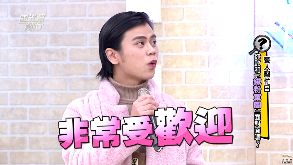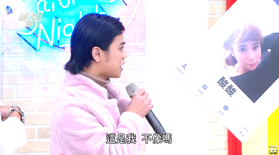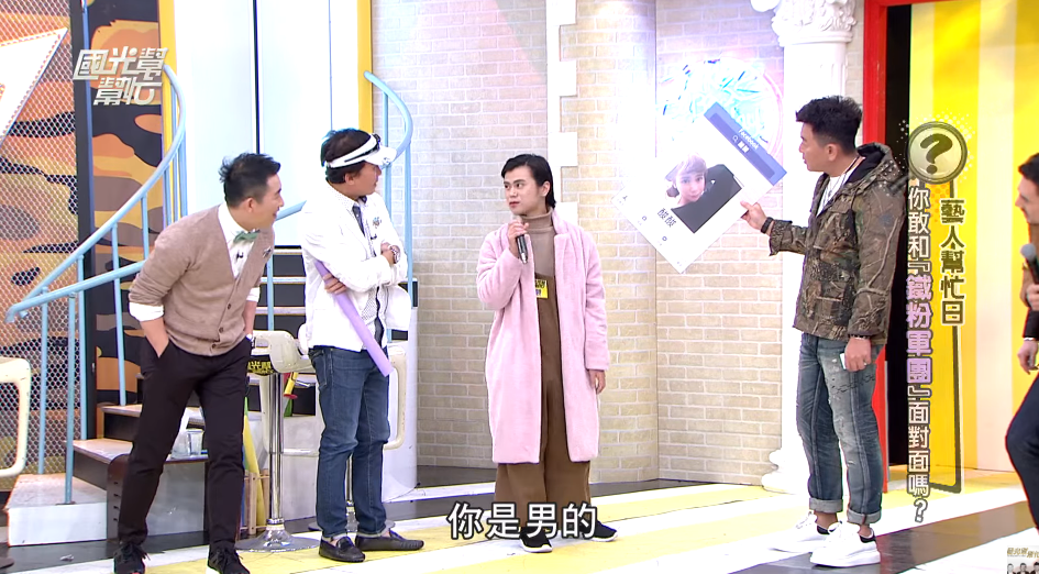 只見影片中,童酸酸以男星「利晴天」粉絲身分上節目,一出場主持人便驚訝詢問:「你是男的?」,他也大方回應:「對,我是男的」,他也在節目中大方對利晴天表白,直言對方是他的天菜,表明自己的同志身分。