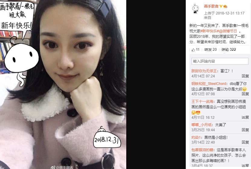 而早在去年,作者就曾在個人微博公開全身照,當時被網友指稱「目測應該有170公分」,而另一張正臉自拍照中,甜美外型和作品暗黑風格相去甚遠,讓網友直呼「真沒想到畫恐怖漫畫的居然是這麼一位漂亮的小姐姐」、「真沒想到畫恐怖漫畫的居然是這麼一位漂亮的小姐姐」。