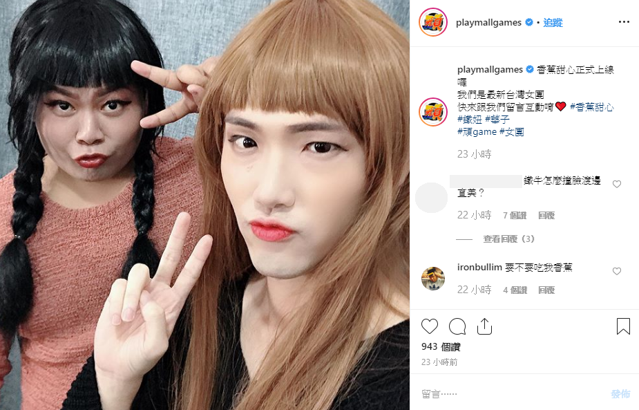 昨(16)日頑GAME在IG中發布照片,搞笑表示:「香蕉甜心正式上線囉,我們是最新台灣女團,快來跟我們留言互動唷」,只見兩人這次都豁出去,改用女裝的扮相拍照!兩人不僅穿著女裝,妝容也十分到位,粉底、眉毛、眼線、紅唇樣樣來,妖嬈的模樣也讓網友乍看之下險些認不出來!