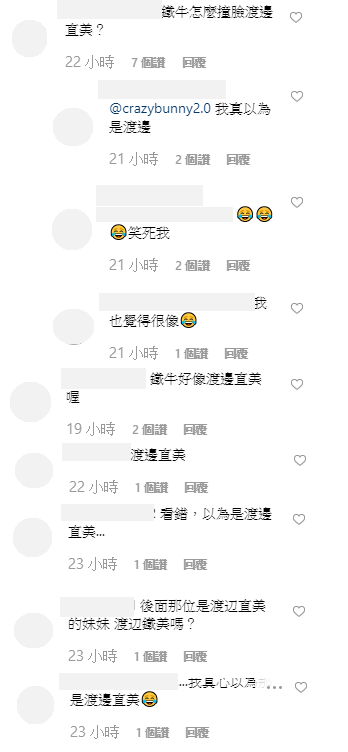 而其中便有網友發現,鐵牛較為圓潤的外型,加上完妝後濃眉大眼的模樣,神似日本女星「渡邊直美」,也紛紛留言:「鐵牛怎麼撞臉渡邊直美?」、「我真以為是渡邊」、「鐵牛好像渡邊直美喔」、「渡邊直美」、「看錯,以為是渡邊直美...」、「剛還以為後面那是渡邊直美」。
