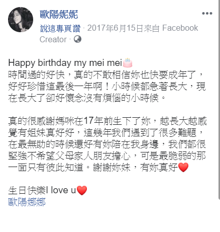 娜娜17歲生日的時候,歐陽妮妮曬出環抱著娜娜的照片,感性說道:「時間過的好快,真的不敢相信妳也快要成年了,好好珍惜這最後一年啊!小時候都急著長大,現在長大了卻好懷念沒有煩惱的小時候……」,並很感謝最無助的時候有妹妹的陪伴。