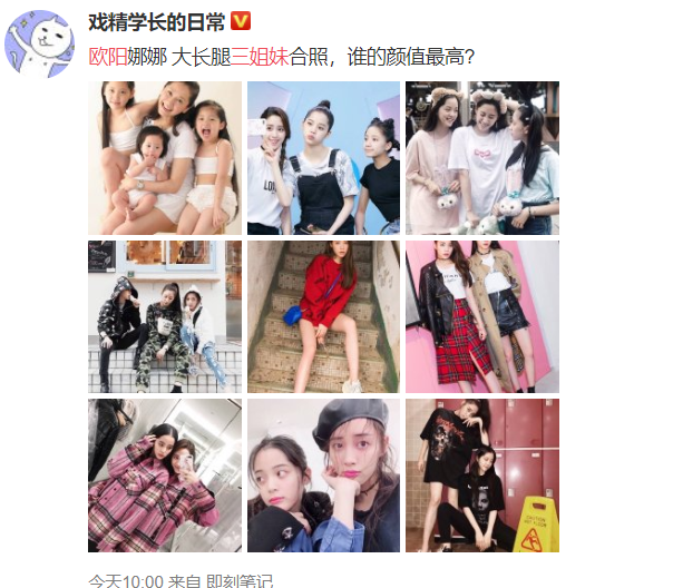 照片中歐陽三姐妹皮膚白皙、加上圓滾滾的大眼,像極了母親傅娟的高顏值,而且還都擁有一雙逆天大長腿,可以看出遺傳了父母的優良基因。最重要的是她們穿著露肚裝,萌死一大票粉絲。