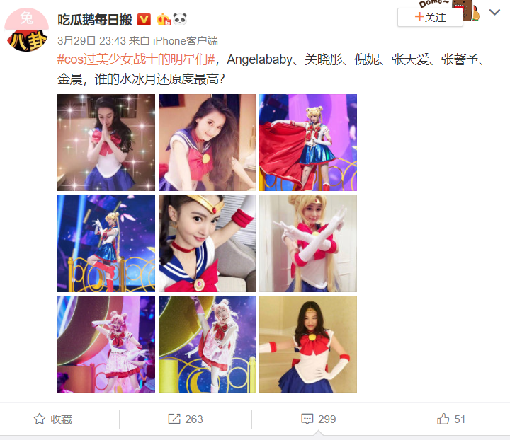 女明星各個化身美少女戰士,擺出經典動作,包括Angelababy、關曉彤、倪妮、張天愛、金晨、張馨予、婁藝瀟、張儷等人。Angelababy本身就非常喜愛美少女戰士,也購買了許多周邊商品,27歲生日時,Angelababy好友倪妮在微博為好姊妹送上祝福,照片中Angelababy在生日派對裝扮成美少女戰士,雙手合十許願,網友看了直誇相似度百分百,baby好美!