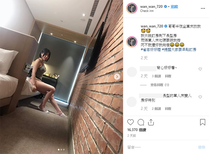 宛宛兒以搞笑影片走紅,總是給人不計形象、瘋癲搞笑的印象,常常上綜藝節目的她,不僅話題百無禁忌,開朗活潑的性格也讓她打響名度。目前IG累積24萬人次追蹤,人氣不容小覷。而近日宛宛兒在IG中公開和男友憶起去旅館約會的照片,性感的模樣也讓網友暴動了!