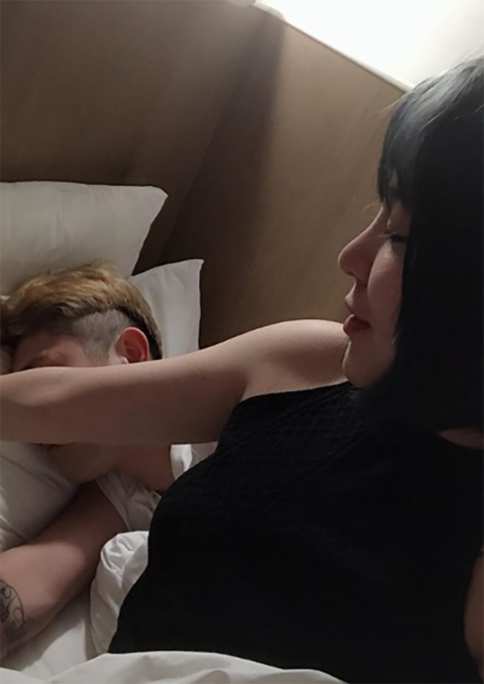 宛宛兒16日在IG中上傳照片,並且打上:「哥哥(指男友)半夜坐車來找我,我太晚訂房剩下長型房,兩張單人床他硬要跟我擠,阿不就還好我夠瘦」,和大家分享自己和男友約會的情趣,只見第一張照片中,她坐在床沿,下半身幾乎一覽無遺,性感爆表,而第二張則是她偷拍男友睡覺的樣子,可見兩人戀情真的相當甜蜜。