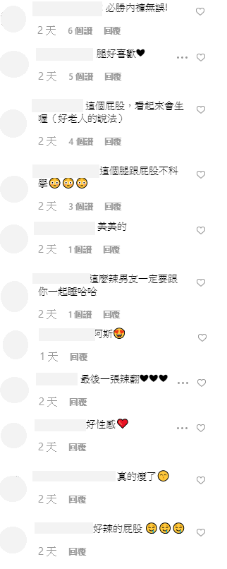 不過許多網友都將焦點放在第三張照片!原來第三張照片中,是男友視角拍攝的性感背影,只見她上半身穿著緊身背心,下半身則是黑色的蕾絲透視內褲,性感的美尻現形,讓網友看了血脈噴張!網友也紛紛留言:「腿好喜歡」、「這個腿跟屁股不科學」、「長腿美女」、「美美的」、「必勝內褲無誤!」、「正翻了」、「怎麼那麼正!!越來越正」、「好辣的身材」、「最後一張辣翻」。