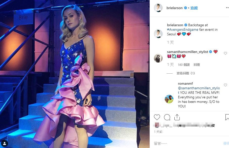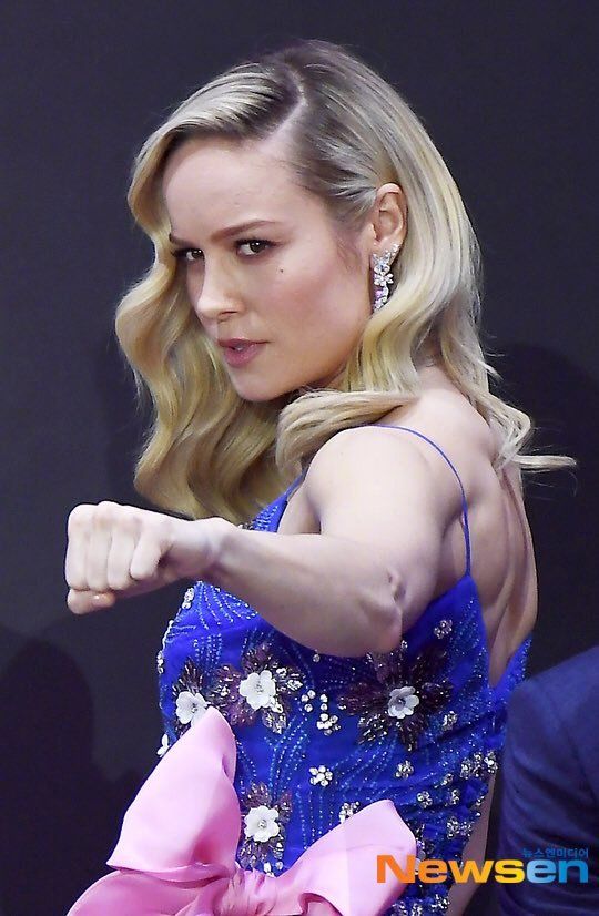 近期正展開世界巡迴宣傳的復仇者演員們,15日也抵達南韓展開記者發布會,當天唯一女演員「驚奇隊長」布麗拉森,身穿的細肩帶寶藍色洋裝而服裝左側則以亮粉色緞帶點綴,完全展現出姣好身材,包括四肢的肌肉線條和背部的肌群全都嶄露無遺。
