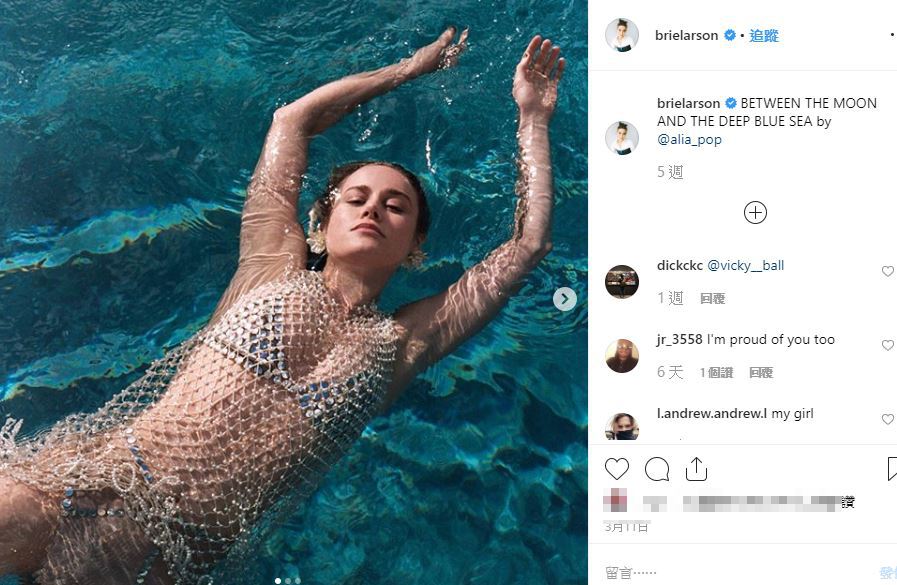 《驚奇隊長》作為漫威首部女性英雄的獨立電影一推出就創下好口碑,事實上布麗拉森脫下驚奇隊長制服後的身材也相當姣好,從他個人IG中可見私下培養的運動習慣,甚至也曬出比基尼照大方秀出豐滿上圍和完美腰線,或是3月在洛杉磯的電影首映會中,布麗拉森穿著薄紗長洋內裡的膚色內搭更顯性感,引起大批粉絲盛讚。