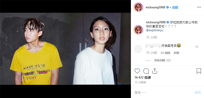 尼克昨(17)日在IG中發文:「好啦就跟大家公布我妹的真面目啦!!」,只見照片中他貼上自己與「妹妹」的照片,不過事實上,照片中的這個女生根本不是尼克真正的妹妹,而是新生代演員「陳妤」,因為兩人都有著深邃的大眼加上豐唇,才意外撞臉。