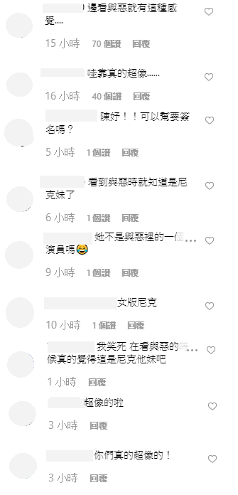 而雖然尼克有在下方標記陳妤的IG「@exploreryu」,不過還是有許多網友表示被騙,意外掀起討論,而其他認出陳妤的粉絲,也在下方留言:「你們真的超像的!」、「我笑死 在看與惡的時候真的覺得這是尼克他妹吧」、「原來不是只有我這樣覺得!」、「女版尼克」、「她不是與惡裡的一個演員嗎」、「看到與惡時就知道是尼克妹了」、「邊看與惡就有這種感覺....」。