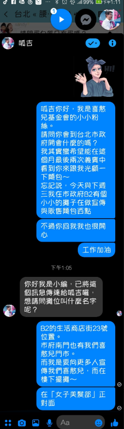網友17日在Dcard發文,表示自己是喜憨兒基金會的人員,很希望能夠在義賣活動中看見呱吉光臨,便私訊呱吉的臉書,「因為在北市府的義賣快結束了!想說試試看,能不能讓我圓一下作為粉絲的夢想~」,沒想到之後便收到了呱吉小編的回覆,詢問攤位名稱。到了義賣當天,原本不抱希望的原PO竟然一抬頭就見到本人,讓她受寵若驚直呼:「我嚇得全身發抖…」。