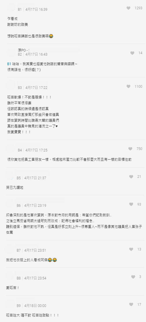 文章發布之後,其他網友也紛紛留言寫下:「呱吉軟爆!不對是暖爆!!!雖然平常很烙賽,但該認真的時候還是很認真」、「很欣賞他把員工當朋友一樣,相處起來壓力比較不會那麼大而且有一樣的目標往前」、「哭已丸讚啦」、「愛呱吉!」、「難得沒烙賽啊啊啊啊」、「呱吉一生推!!!!!!!!」。