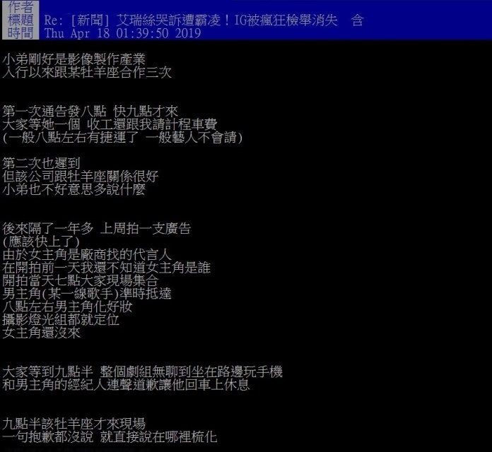 近日有網友在PTT中爆料,指出自己在影像製作產業,入行以來跟艾瑞絲合作過三次,這三次艾瑞絲都遲到,並且第一次還跟他請了計程車的費用,「八點左右有捷運了,一般藝人不會請」。除此之外他更表示第三次合作時,艾瑞絲遲到了兩個小時,卻完全沒有道歉,「一句抱歉都沒說 就直接說在哪裡梳化」。