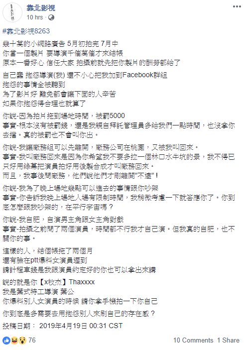 文中葉公還提到在PTT的黑特文,表示艾瑞絲凹錢一事完全是誤會,「這樣的人,結個帳拖了兩個月,還有臉在ptt爆料女演員遲到,請計程車錢是我跟演員約定好的你也可以拿出來講」、「你爆料別人女演員的時候 請你拿手機拍一下你自己」。