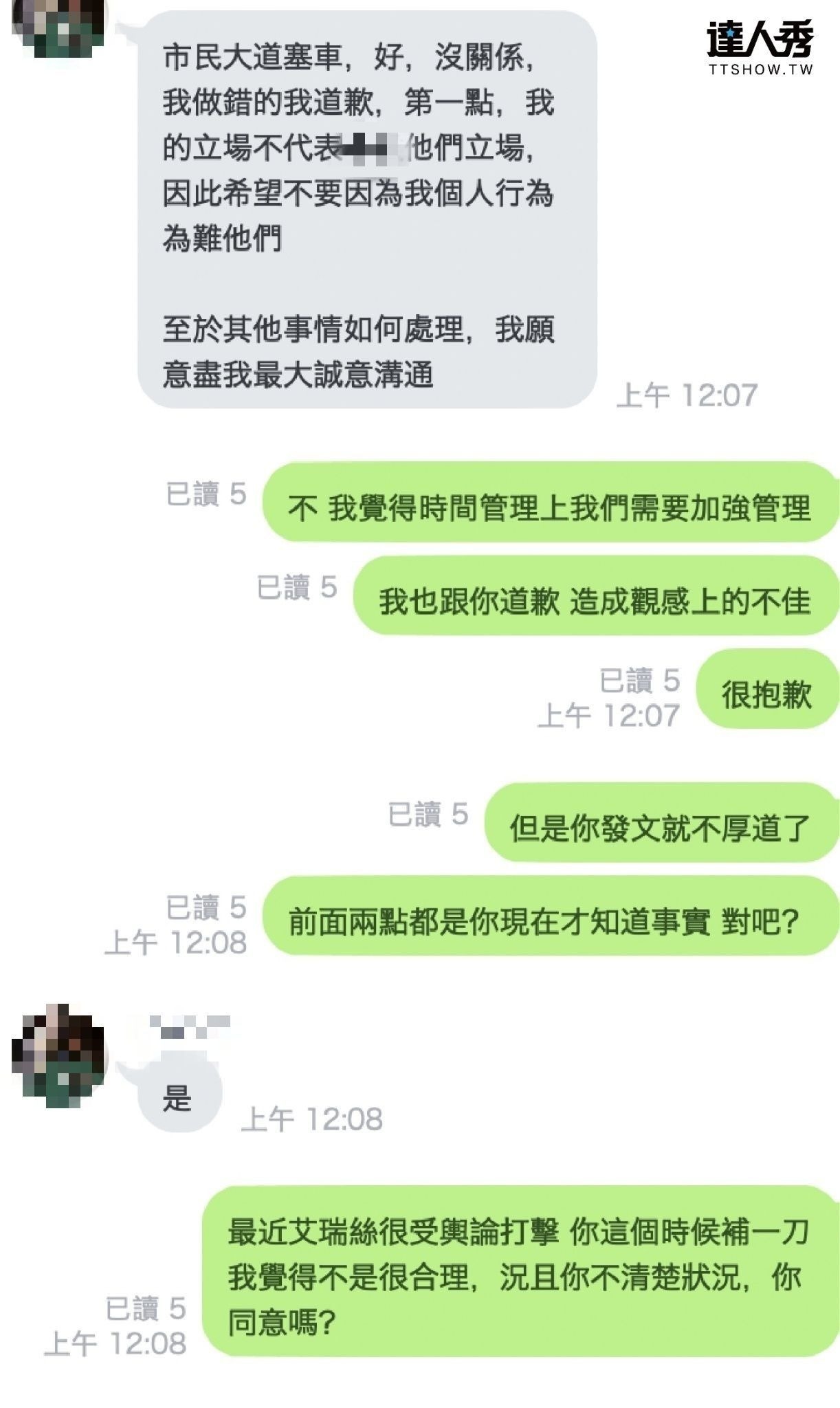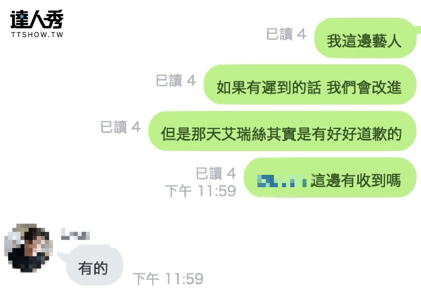 反骨經紀人坦言艾瑞絲過去確實有遲到,當日司機大哥不小心開錯路,讓她在路上耽擱了。不過經紀人同時也強調艾瑞絲當天雖然遲到,然而並沒有爆料所述兩個小時那麼久,並且到現場後,她也有向大家道歉,更提供了對話截圖,證明對方也確實有收到艾瑞絲的道歉。另一方面,反骨也表示遲到就是不對,「我們公司是有嚴厲的責備藝人的」。