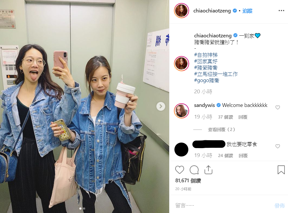 近日曾之喬在IG上分享與姐姐之縈的合照,當時姊妹倆恰巧都穿著相同顏色的牛仔襯衫,而畫面裡曾之喬俏皮地露出舌頭看起來相當開心,一旁的姊姊則是一手拿著耳機一手拿著飲料杯,對著鏡頭露出靦腆的微笑,曾之喬在內文寫到「一到家 豬喬豬縈就撞衫了!」並標記#自拍神梯#回家真好#豬縈豬喬,姊妹兩人一同在電梯拍的美照更是讓許多粉絲傻傻分不清哪一位才是曾之喬本人。
