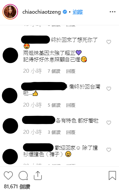許多藝人看到這篇貼文也在下方留言回應,像是藝人吳姍儒留言「Welcome backkkkkk」、男演員楊銘威則留言「矮油 豬縈瘦囉」,其他粉絲也開心回應表示「真的撞衫啦!本來快睡著 看喬po文回台灣真的太開心了」、「終於回來了想死你了,兩姐妹基因太強了超正」、「各有特色 都好看啦」、「歡迎回家! 除了撞衫還撞色(褲子)」、「漂亮姐妹花」、「這兩位是國中生嗎?」,難得的組合讓網友大感驚艷。