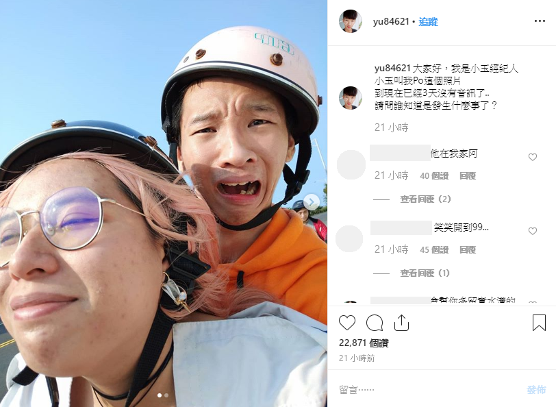 小玉的IG在昨日更新貼文,只見他發布了一張由笑笑載著小玉的照片,當中笑笑掛著一抹微笑,小玉的臉部表情則相當驚恐,而文章中則打上:「大家好,我是小玉經紀人,小玉叫我Po這個照片,到現在已經3天沒有音訊了..,請問誰知道是發生什麼事了?」,文章一發布讓粉絲相當困惑。