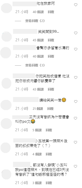 粉絲紛紛留言:「他在我家阿」、「會幫你多留意水溝的」、「你把笑拍成這樣 他沒把你做成肉醬你該慶幸了」、「三天沒有音訊為什麼還會叫你po文」、「你說他不見,但是他又叫你po這個照片?」、「什麼情况??」,不太相信小玉真的失蹤,更因為照片中笑笑的表情意外的逗趣,同樣也引起許多粉絲討論。