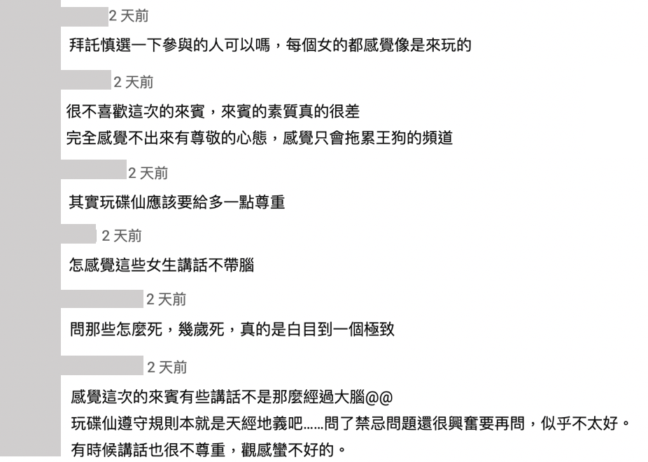 接著一行人開始觸犯了碟仙的禁忌,路路便開始詢問有關碟仙個人的問題,像是:「你是男的嗎?」、「你是誰」、「你是怎麼過世的」等這些問題,而這一連串的問題碟仙也給予相當明確的答案,歸納出碟仙為男性且是因為車禍過世的,然而網友看完這部影片後,紛紛開始砲轟來賓們,認為他們觸犯了禁忌非常不尊重,紛紛留言:「怎感覺這些女生講話不帶腦」、「拜託慎選一下參與的人可以嗎,每個女的都感覺像是來玩的」、「問那些怎麼死,幾歲死,真的是白目到一個極致」、「其實玩碟仙應該要給多一點尊重」