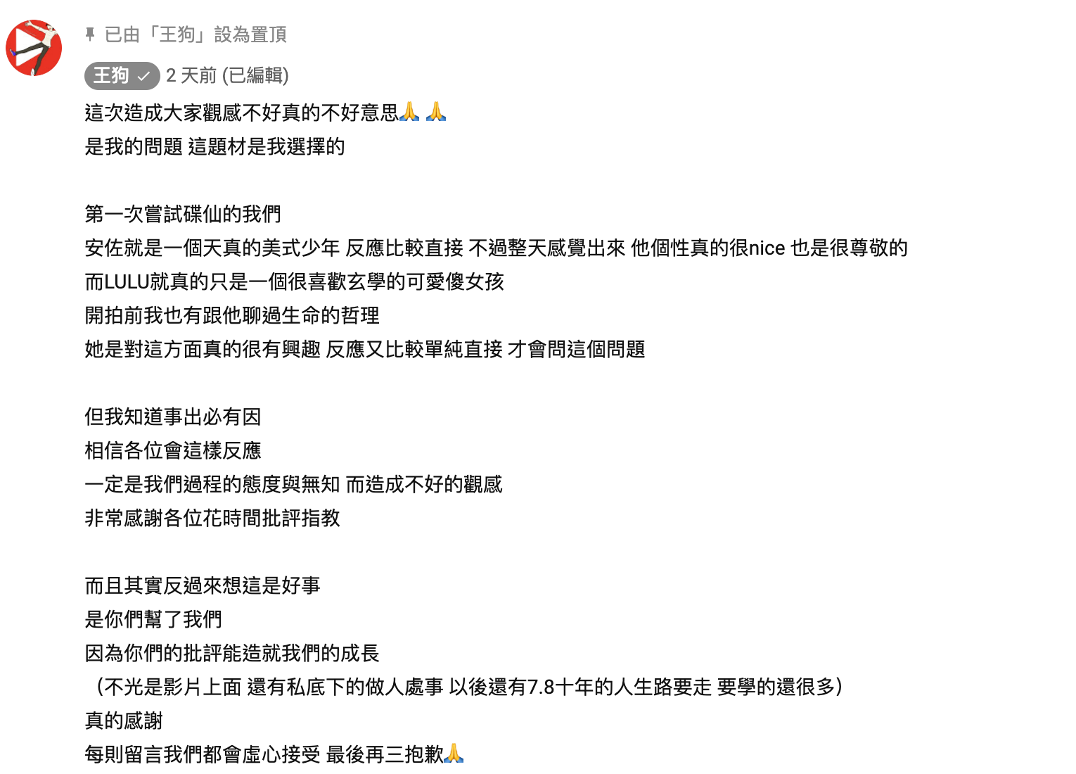 網友也都希望王狗能夠慎選合作的對象,認為這次的來賓表現出來的素質真很差,且完全感覺不出來有尊敬的心態,深怕王狗的頻道會被拖累,而王狗也在留言處回應:「這次造成大家觀感不好真的不好意思,是我的問題,這題材是我選擇的。安佐就是一個天真的美式少年 反應比較直接 不過整天感覺出來 他個性真的很nice,也是很尊敬的。而LULU就真的只是一個很喜歡玄學的可愛傻女孩,開拍前我也有跟他聊過生命的哲理,她是對這方面真的很有興趣 反應又比較單純直接,才會問這個問題」,也在文末處再次跟大家道歉。