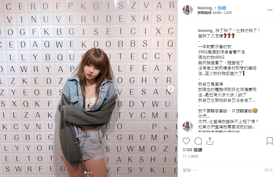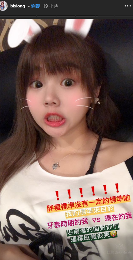 比熊昨(18)日在IG中發文,「胖了胖了!比熊你胖了!變胖了又怎樣」,無奈表示很多人都說她變胖了!比熊說明過去她戴牙套時,曾經瘦到39公斤,現在則是48公斤,雖然現在臉變圓,腿也變粗,不過比熊也開心表示:「至少我的胸部變大了」。