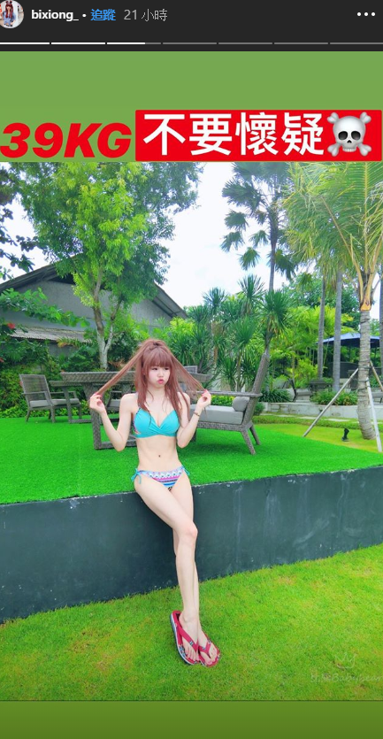 從比熊的限時動態來看,可以發現比熊過去真的超級瘦,不僅四肢纖細,就連腰腹的排骨都清晰可見,對比現在健康的身材真的相差許多。她也放上比基尼的照片,和大家分享姣好身材,「我覺得現在肉肉的我,健康也很有氣色」。