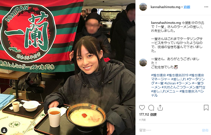 今年20歲的日本女星橋本環奈,當初在家鄉福岡以「奇蹟的一張」照片在網路上爆紅,擁有千年一遇美少女的稱號,進入演藝圈發展後也累積多部電影電視劇作品,包括《銀魂》、《我是大哥大》等,至今也推出兩次寫真集,是未來極具潛力的女星之一,而近日橋本環奈的IG上分享了一張她與知名拉麵一蘭的合照,瞬間掀起網路熱議,貼文按讚數超過17萬,透過事後照片可以看到當時拉麵店的男員工全擠成三排和橋本環奈合照,可見她的魅力更勝過人氣拉麵一蘭。
