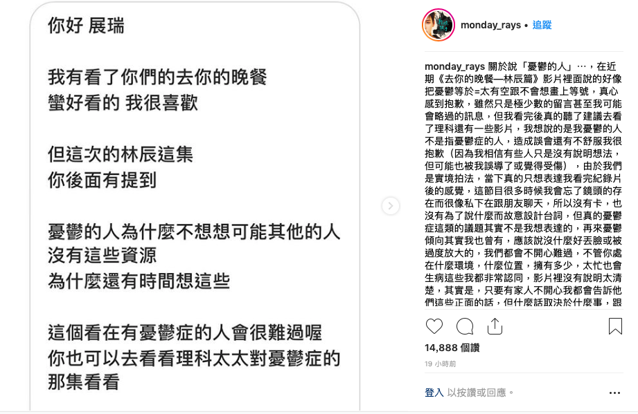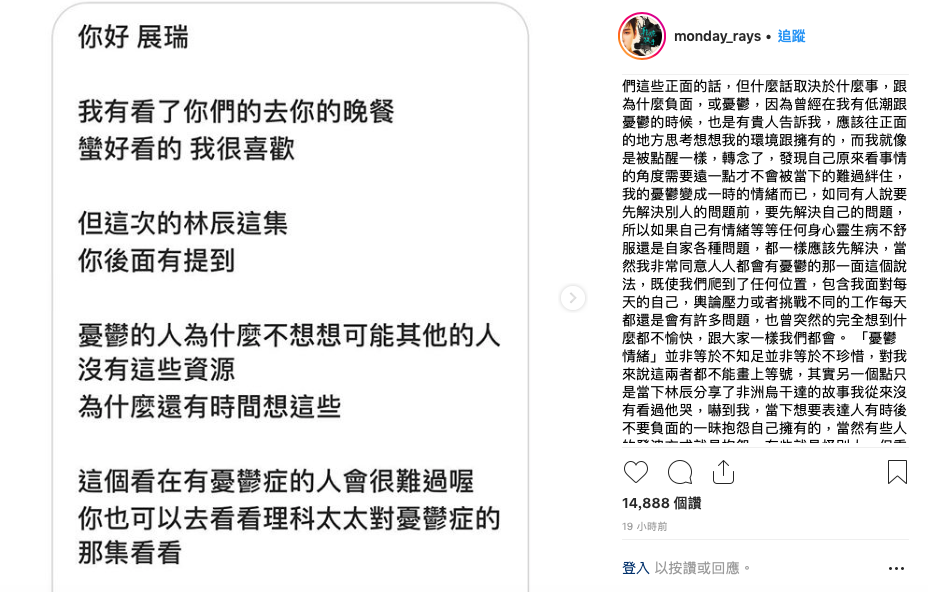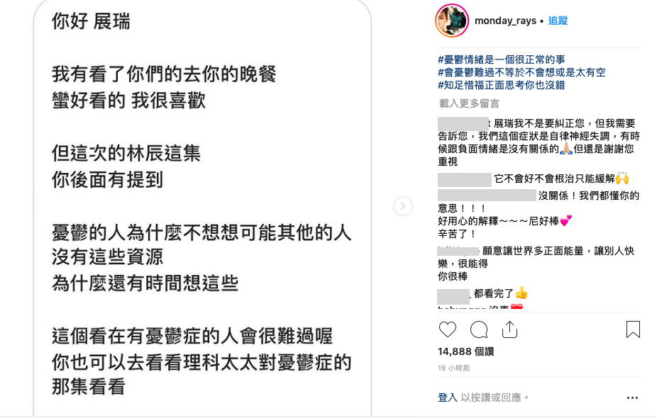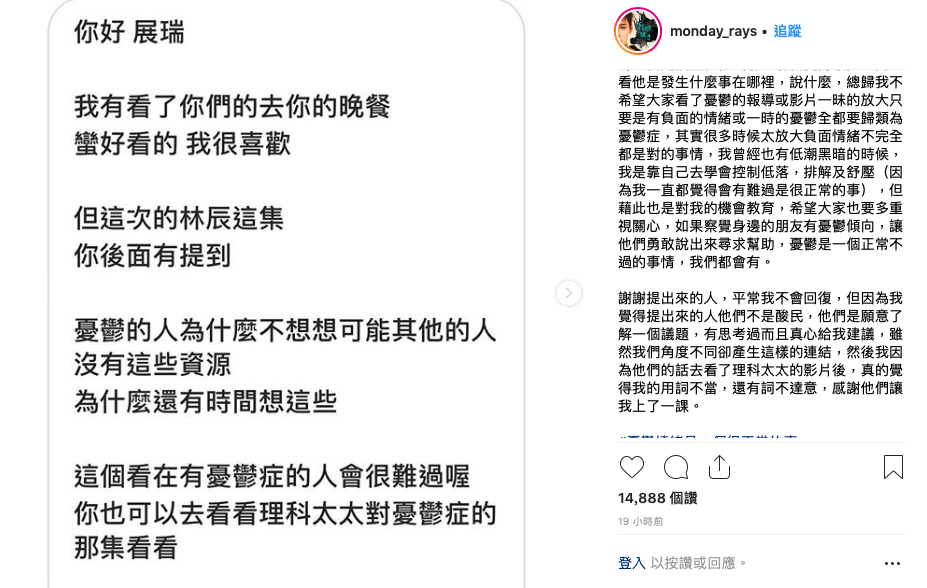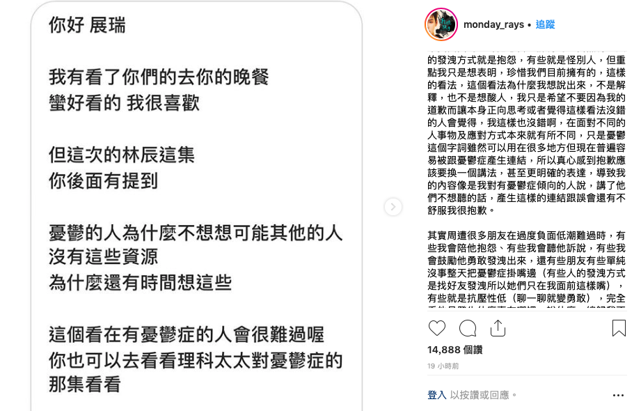 展瑞這番話,讓網友有一些不同的聲音:「這些看在有憂鬱症的人會很難過喔。」還建議展瑞去看理科太太談及憂鬱症的影片。對這項爭議,展瑞很快在IG發了長篇文章回應,開頭即表示:「真心感到抱歉。」不但依照網友建議看了理科太太的影片,他也解釋他說的憂鬱傾向並不等同於憂鬱症,談及自己也有負面的時候與紓壓方式,他也說憂鬱症不等同於不知足,最後以自己「用詞不當」做為結尾,相當有誠意的回覆,也成功讓一些網友接受他的失言。