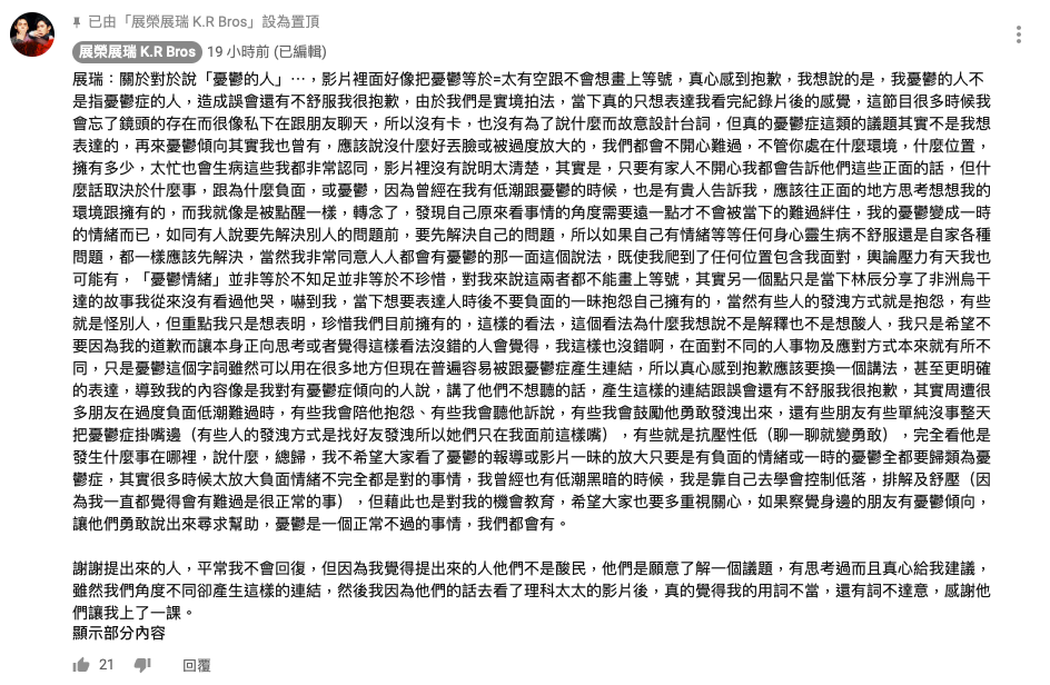 除了IG之外,展瑞也很快在影片底下置頂了相關的解釋文章,內容與IG大同小異,他表示「平常我不會回覆,但因為我覺得提出來的人他們不是酸民。」積極表達對於這次爭議的重視,看來他們對於頻道的留言與IG訊息都有認真瀏覽,在很快的時間內做了危機的公關處理,也藉由自身想法,與網友有了更多討論的機會,俗話說:「危機就是轉機。」實為一個很好的網紅公關處理案例。