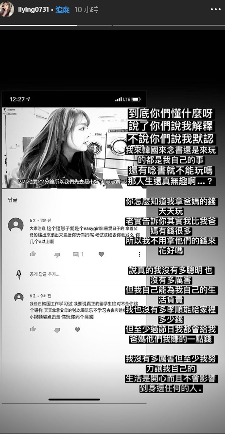 一番話讓劉力穎相當氣憤,便在IG限時動態中發文回應,開頭就打上:「到底你們懂什麼呀?」,她表示自己無論解不解釋都裡外不是人,「我來韓國來念書還是來玩的都是我自己的事,還有念書就不能玩嗎?那人生還真無趣啊」。