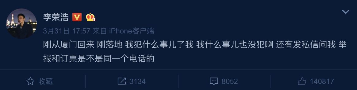 過去李榮浩發文都相當有綜藝感,粉絲們的回應也都相當搞笑,像是在3月31日時,李榮浩曾發過一則貼文寫下:「剛從廈門回來,剛落地,我犯什麼事兒了我?我什麼事也沒犯啊!還有發私信問我,舉報和訂票是不是同一個電話的?」,並附上一張他在廈門地鐵站的宣傳看板,而看板上面的跑馬燈寫:「平安廈門。舉報電話」,在海報照片中剛好身穿黑衣,再配上酷冷的表情,這樣的上下組合,乍看真會讓人錯以為是通緝海報。