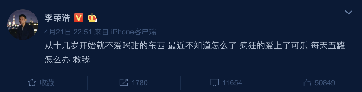 昨日晚間李榮浩發文寫下:「從十幾歲開始就不愛喝甜的東西,最近不知道怎麼了,瘋狂的愛上了可樂,每天五罐,怎麼辦,救我」,然而粉絲們看見李榮浩的求救文之後,也紛紛在底下搞笑的留言:「真富有啊哥啥家庭啊」、「哥,咱控制一下量。想喝的時候就把嘴用膠紙封起來」、「哥,可樂喝多了你會擁有雙下巴,多喝會致死,冷靜一點行不」、「可樂殺精」、「年齡大了 適當控制一下」、「你告訴自己喝可樂眼睛會變小」,粉絲們的留言都相當有創意,然而李榮浩也搞笑的回覆了一些粉絲的留言。
