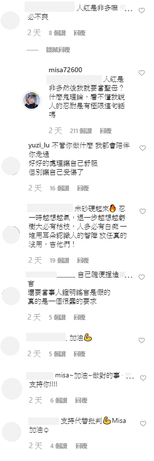 米砂也在留言處提到:「人紅是非多然後我就要當聖母?」,相當氣憤。文章發布之後,許多網友也紛紛替她加油打氣,就連YouTuber路路都回覆:「不管你做什麼 我都會陪伴你走過,好好的處理讓自己舒服,但別讓自己受傷了」,相當暖心。