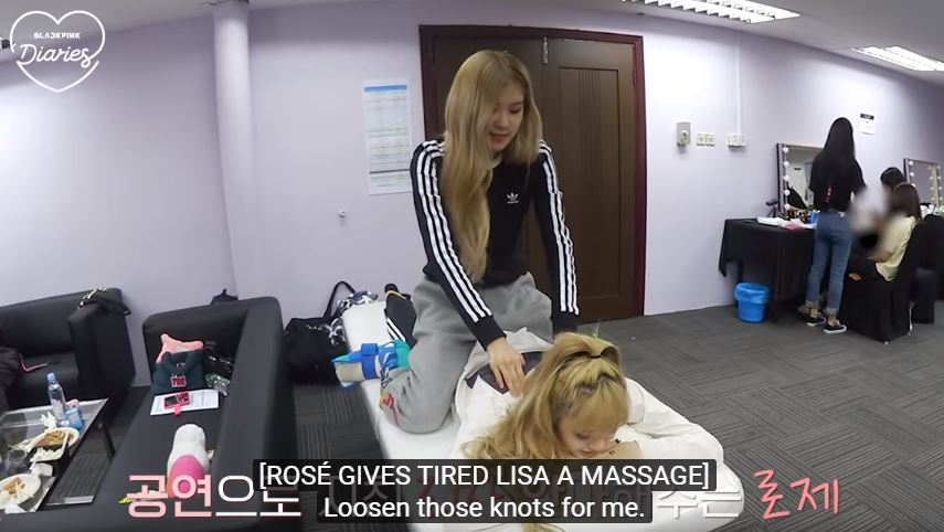 而影片中,也曝光一段成員Lisa和Rose幫彼此按摩的畫面。當Rose坐在Lisa背上以棍棒按壓後背和腰部時,Lisa則不斷回應「對對對!就是那裡」,而輪到Rose趴在床上時,也可見包在他右腳踝上的大石膏,為此,Rose解釋腳踝二度受傷,不過他也貼心向外界表示「沒有到很嚴重」示意粉絲不用擔心。
