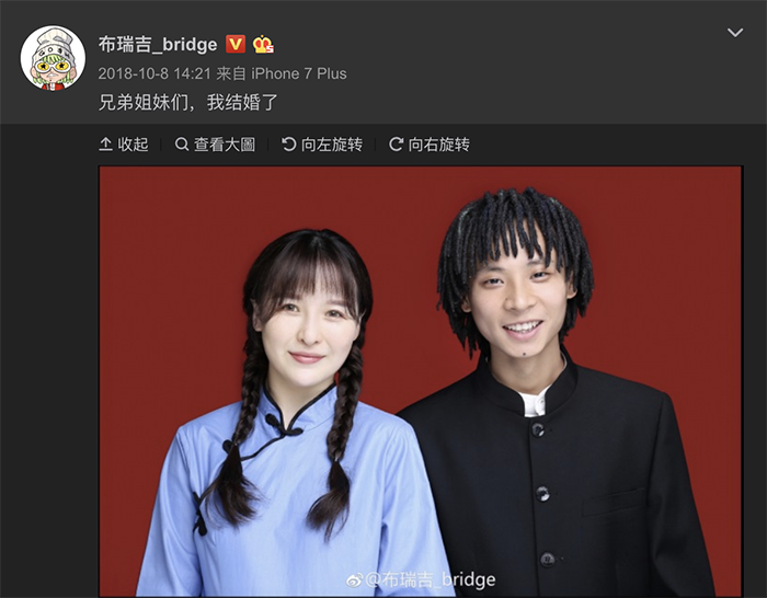 因大陸說唱節目《中國有嘻哈》而爆紅的嘻哈歌手「Bridge」在21日時在微博上曬出和老婆的婚禮現場的照片,而兩人早在2018年10月8日時,Bridge在微博上宣布自己结婚了,並且曬出了兩張與妻子的合照,時隔6個多月兩人在昨日舉辦婚禮,而昔日比賽的好戰友GAI、小青龍等人都到場祝賀。其中,網友更發現Bridge的老婆相當的漂亮,引發熱烈討論。