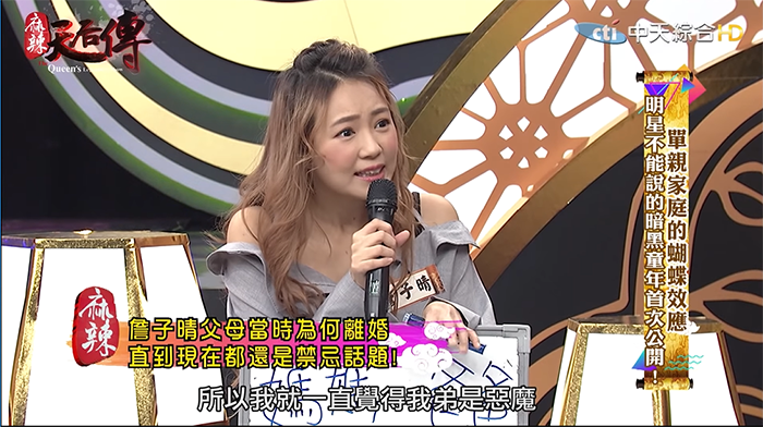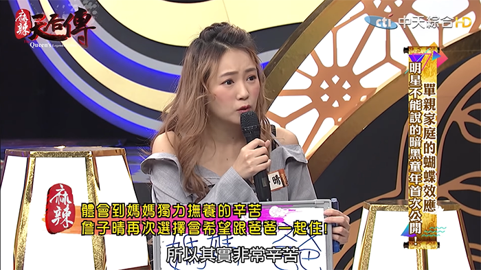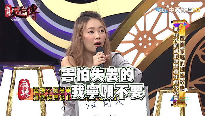 丫頭透露,如果再給她一次機會,她會選擇跟著爸爸生活,「你經歷過她很辛苦的過程,你就會很心疼她」,因為媽媽是標準的家庭主婦,沒有甚麼工作經驗,離婚後一個人要扛下兩個孩子的負擔,眼睛和手都因為工作壞掉,讓丫頭看了非常不捨。不過問起父母的離婚原因,丫頭直說這個話題在他們家仍是個「禁忌話題」,媽媽完全不想提起,成了她一輩子的謎。