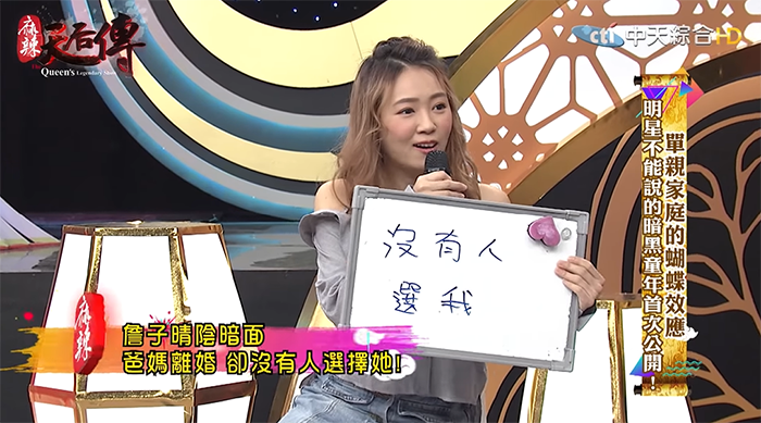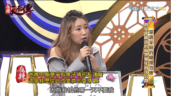 丫頭透露,在她7歲之前家中非常富裕,住在獨棟豪宅,有花園、小橋流水甚至還有大型鞦韆,直到弟弟一出生卻什麼都變了。「弟弟一出生以後他們就開始吵架,然後我印象中就再也沒有人愛過我了。」就連爸爸媽媽在離婚協議時,也沒有人願意爭取丫頭的監護權,這個舉動深深影響了丫頭在學校及在感情中的觀念。