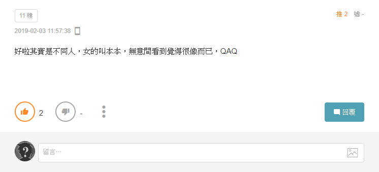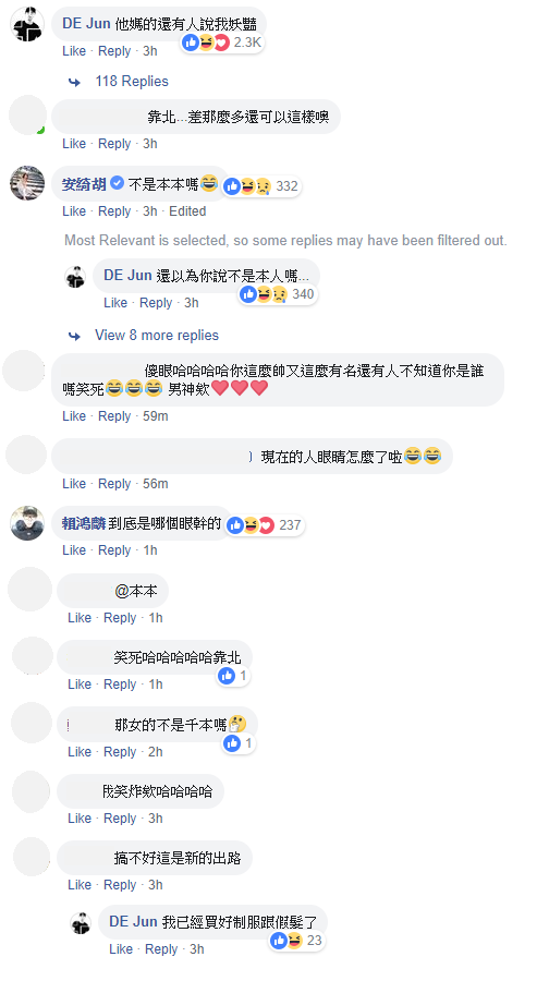 DE JuN發到自己的板上後,自己也再度留言:「他X的還有人說我妖豔」,真的好氣又好笑,而其他網友也留言:「不是本本嗎」、「現在的人眼睛怎麼了啦」、「到底是哪個眼X的」、「你到底在多才多藝什麼」、「差很多好嗎 DE扮女生一定比她正」,還有網友搞笑建議「搞不好這是新的出路」,DE JuN也妙回:「我已經買好制服跟假髮了」。