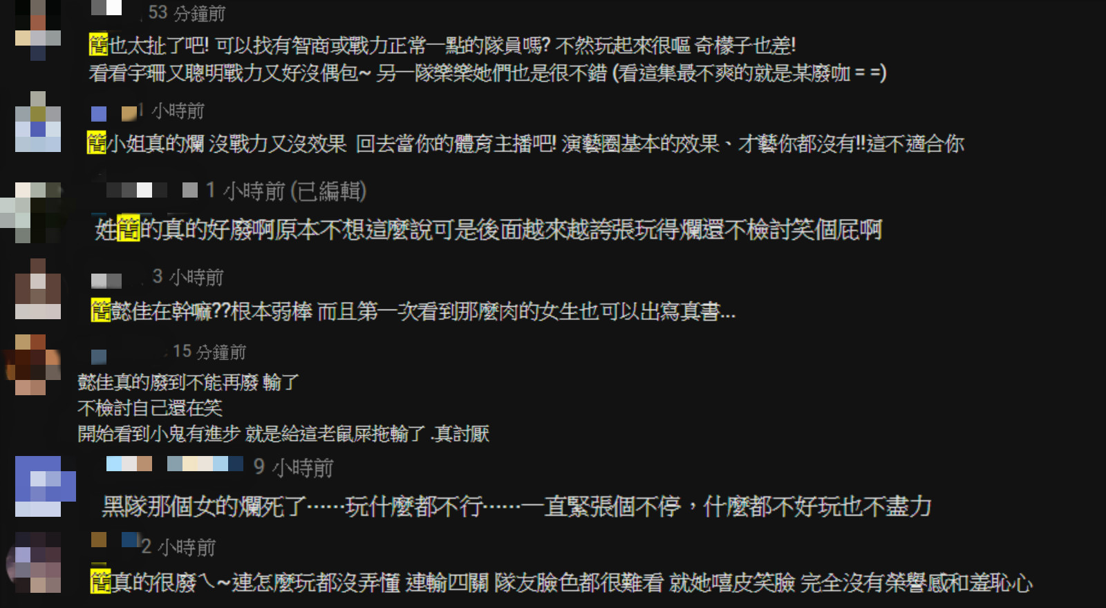 但接下來跟KID比肺活量,不到一秒又失敗;比運氣又輸給了楊晨熙,一個人一連輸了對方4個人,讓黑隊隊員面有難色,網友也看不下去痛批:「簡懿佳真的超廢,從第一關廢到最後,輸了還笑笑這樣」、「簡那廢棒也廢得太誇張,別人是玩不過,她是怎麼玩都不知道就直接上場?這樣看得真的很累,跟直接認輸有什麼兩樣,真是是大雷包」、「簡懿佳一直輸宇珊臉超臭XD」、「那個姓簡的真的是廢咖」、「簡懿佳真的是豬隊友,玩得懶懶散散一點都沒有盡力在玩的樣子」、「黑隊老鼠屎」。