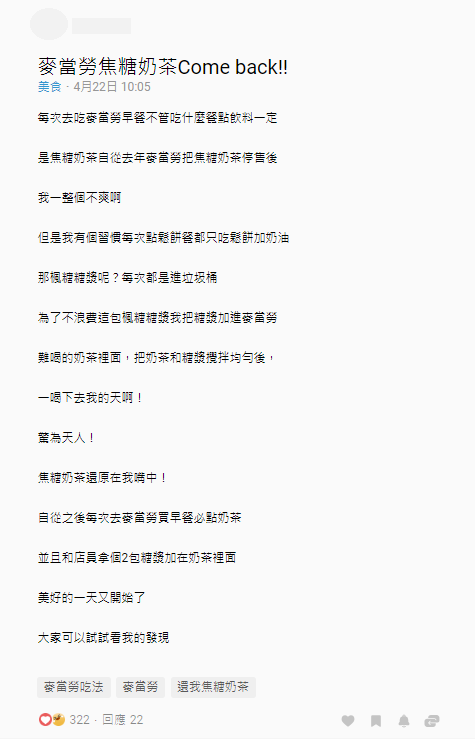 麥當勞自去年開始停售焦糖奶茶,讓許多焦糖奶茶的愛好者難以接受,甚至臉書中還出現「還我焦糖奶茶!」的粉專。而昨日突然有網友在Dcard發文 《麥當勞焦糖奶茶Come back!!》,原po表示自己發現只要將鬆餅的「楓糖糖漿」加入麥當勞現在的奶茶中,就能重現焦糖奶茶的滋味,「一喝下去我的天啊!驚為天人!焦糖奶茶還原在我嘴中!」