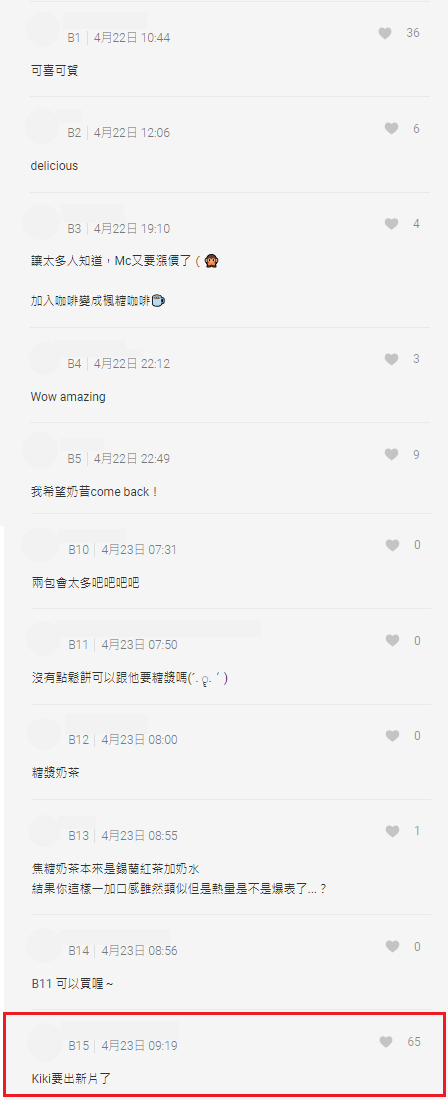 文章上傳之後,許多網友紛紛留言:「可喜可賀」、「讓太多人知道,Mc又要漲價了」、「Wow amazing」、「我也都這樣喝奶茶,味道真的87%像!!!」、「真假啊啊啊」,也有網友故意調侃Kiki:「Kiki要出新片了」。