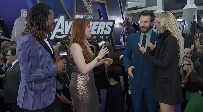 在訪問到一半時,小辣椒和美國隊長也一起加入訪問,而當被主持人問到「印象最深刻的拍攝場景是什麼」時,小辣椒正要回答之前,快樂霍根還笑著提醒她:「小心說喔!」,接著小辣椒先是表示:「這個問題很難回答」。(以下爆雷,請反白看內文)接著說道:「我不確定是不是最後一天的拍攝,但我們全部人都在一起,這非常令人感動,所有的電影演員都聚在一起」,說完後她轉頭詢問快樂霍根「這個能說嗎」,而快樂霍根也搖頭表示不知道,讓小辣椒脫口而出「OH!SHIT」,意外的爆雷了劇情,下一刻馬上被美國隊長帶離場。