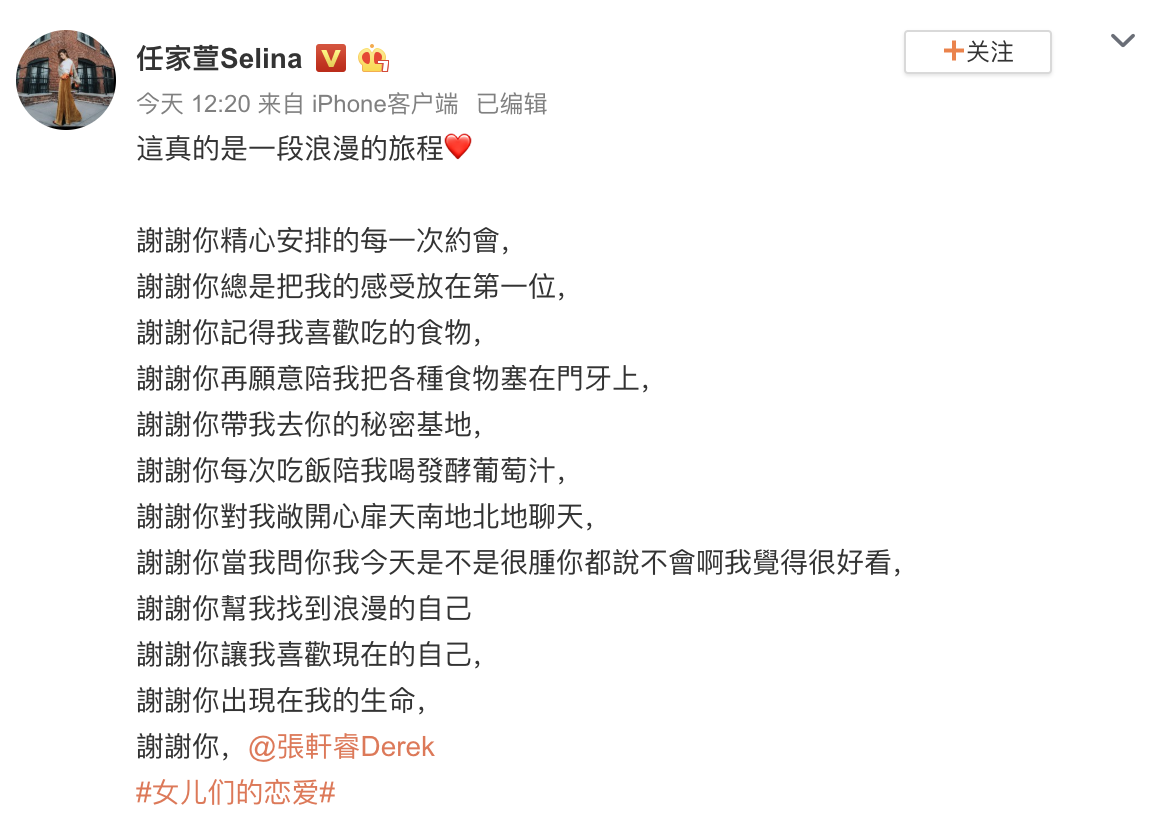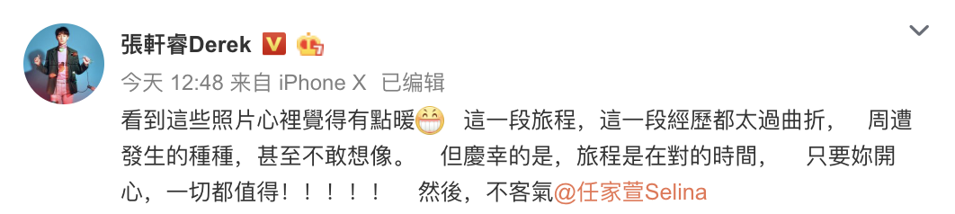 Selina也在今天中午時在微博發文,對於張軒睿這些日子來的貼心事蹟一一的道謝,在最後也寫下:「謝謝你讓我喜歡現在的自己,謝謝你出現在我的生命,謝謝你,張軒睿」,其中五月天的阿信也在下方留言:「beautiful shero」,一起替Selina感到高興。而張軒睿也轉發貼文寫下:「看到這些照片心裡覺得有點暖,這一段旅程,這一段經歷都太過曲折,周遭發生的種種,甚至不敢想像。 但慶幸的是,旅程是在對的時間,只要妳開心,一切都值得!!!!然後,不客氣」,兩人甜蜜的發文閃瞎全網。