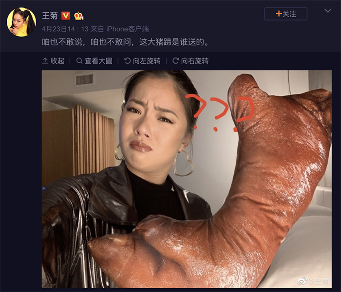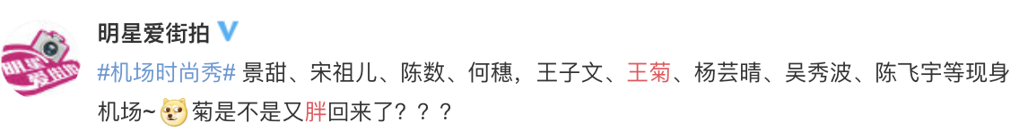 照片中王菊身穿一件緊身的黑色運動衣,並露出了一小塊腰間,下身穿著一件黑色貼腿緊身褲,而他的腰間看起來似乎有些小腹,一名時尚博主發出許多明星的機場照後,寫下:「菊是不是又胖回来了???」,除了身材之外,另一個令人相當關注的焦點則是她手上拿著一個豬蹄的抱枕,該抱枕是粉絲送給她的禮物,事後她也在個人微博上發文寫下:「咱也不敢說,咱也不敢問,這大豬蹄是誰送的。 」,並附上一張她拿著豬蹄相當困惑的自拍照,就有網友猜測這禮物「是在說王菊是個大豬蹄子嗎?」。